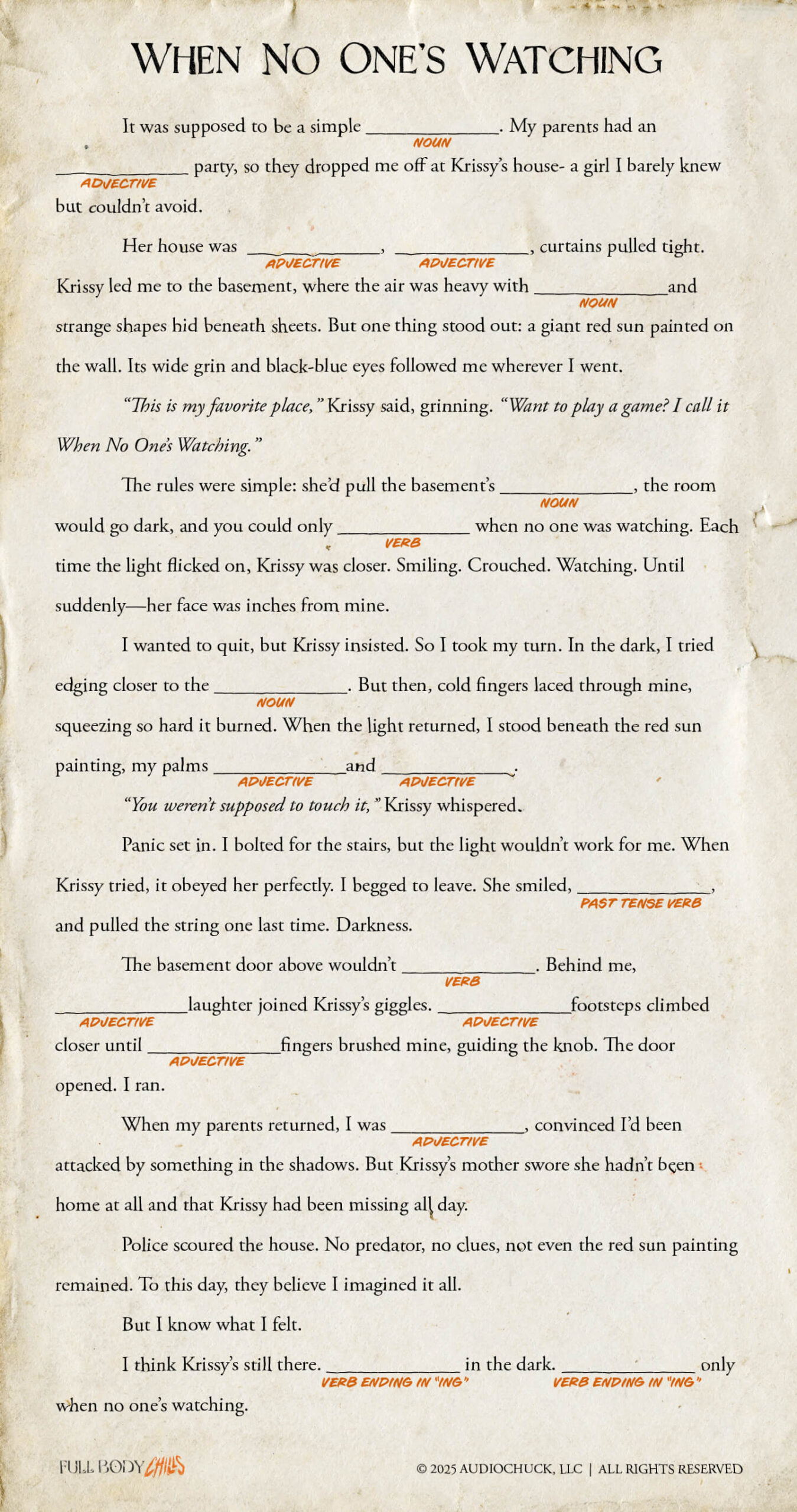 This Fill-In-The-Blank allows you—the listener—to create a spooky story of your very own! Based on “When No One’s Watching” from Season 7, you can fill in each word totally alone or with a frightful friend. Once you’ve selected all your nouns, verbs, adjectives, etc. tell your friends to gather ‘round and listen close to the nightmare narrative you’ve created!